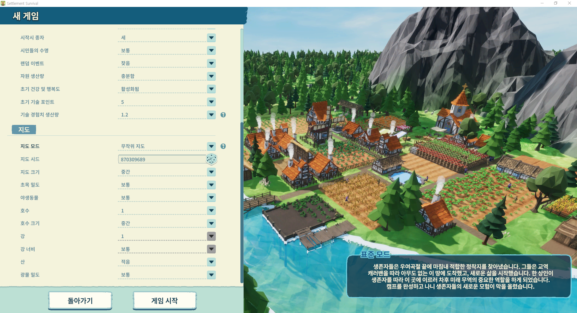 설정에서는 맵크기나 난이도 설정 등이 가능하게 되어있는데 나중에는 어렵게 설정해보려 하고, 지금은 자연재해도 꺼놓으면서 쉽게쉽게 한번 플레이했습니다.