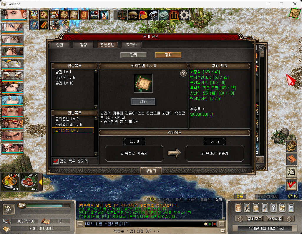 지금은 제가 두문신장을 잡고 있는데 속성값 차이도 크고 여기서부터 디버퍼 계열의 장수들이 점점 쓸모가 다해서 꽤나 사냥이 힘들었는데 뇌진법 10강 하고나니까 많이좀 편해 졌습니다.